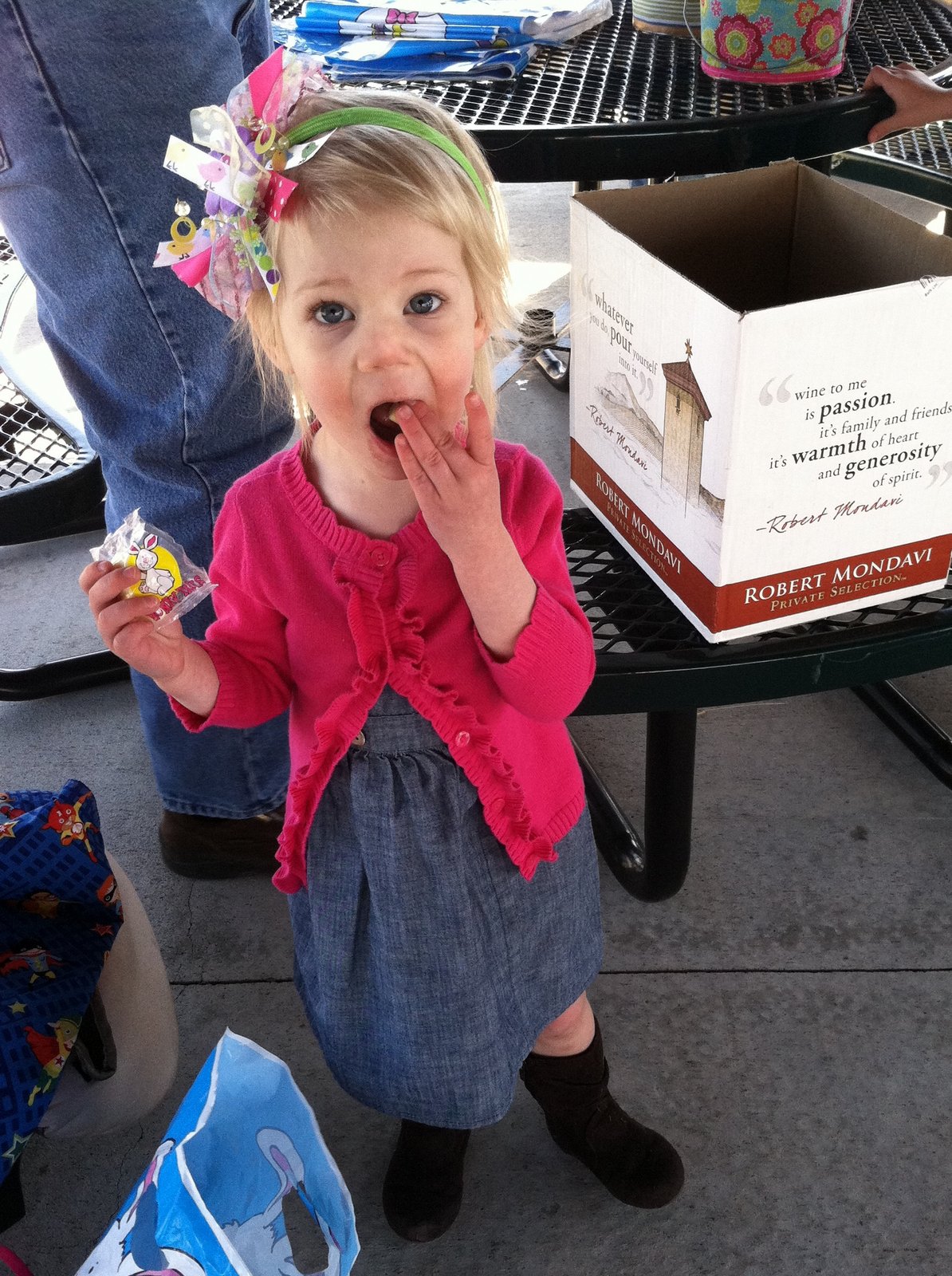 | we went to the egg hunt in my in laws neighborhood. it was legit. skittles, starbursts, these sugar coated lifesaver gummis... loving the eater candy. baby girl liked it too dangit. |